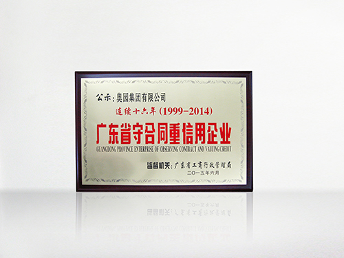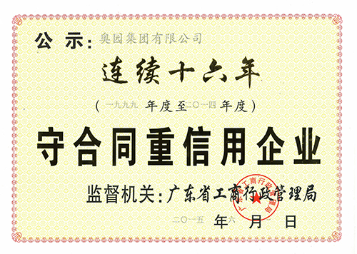 奥团连续十六年荣膺“广东省守合同重信用企业”称号
