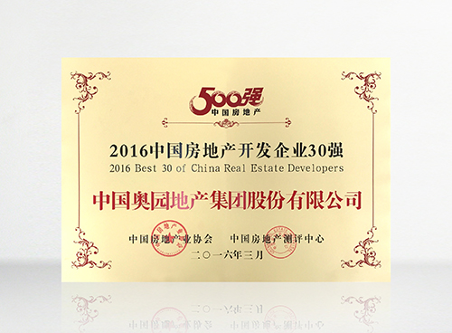 “2016中国房地产开发企业30强”第29名荣誉证书