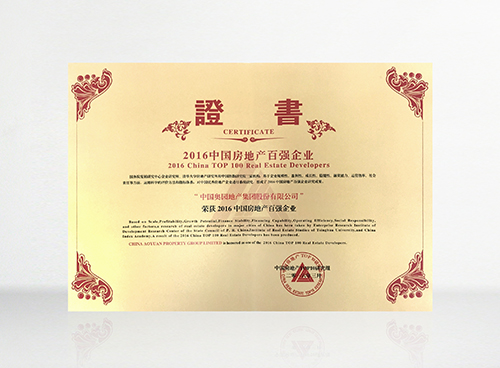 “2016中国房地产百强企业” 第29名荣誉证书