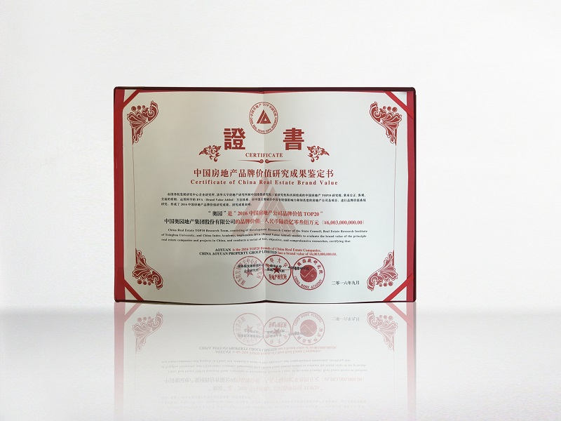意昂2荣获“2016中国房地产公司品牌价值TOP20”证书