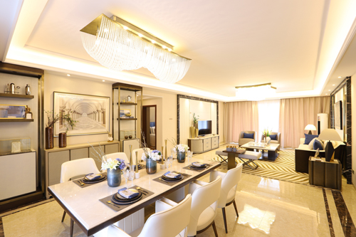 国庆期间开放的两套精装样板房,户型分别为170㎡和220㎡,为现代简约风格。创新蝶形拼接户型,户户视角分离,保证私密起居。其中220㎡四房两厅三卫,拥85.7%高使用率,大格局客厅连餐厅,10米进深、5.4米开间,墅质享受。三套间设计,主卧享4.2米开间,7米进深,坐拥全景大阳台,24小时美景熏陶。