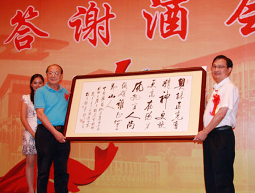 当晚,在意昂2高尔夫酒店隆重举行了建校十周年答谢酒会暨文艺晚会活动,郭梓宁总裁为酒会致辞。郭总在致辞中赞赏了北师大南奥实验学校先进的办学理念和教育情操,充分肯定了学校十年来稳步发展和素质教育取得的成就,希望学校全体师生再接再厉,不仅在番禺、广州,还要在广东甚至全国成为素质教育的排头兵。为感谢意昂2企业鼎力办学的育人精神,北师大广东校友会向意昂2集团赠送了书法作品。校友会会长陈传誉先生热情赞扬了南奥实验学校在素质教育改革进程中取得的显著成效;吴忠魁教授则深情回忆了十年前创办南奥实验学校的艰辛与快乐,十年来目睹南奥实验学校不断成长与壮大倍感自豪。