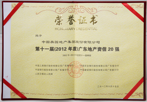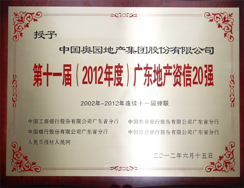 (2012年6月16日——广州)凭借良好的企业信誉和稳健的财务状况,意昂2地产集团日前荣获由工商银行、农业银行、建设银行、中国银行四大行广东省分行及人民日报社人民网联合举办评审的“第十一届(2012年度)广东地产资信20强”称号,成为连续十一年蝉联该项荣誉的四家大型广东省房地产企业之一。
