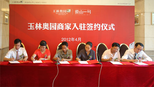 (2012年4月29日——玉林)玉林意昂2商家入驻签约仪式的玉林意昂2营销中心隆重举行,2座首层风情商铺全城启动预约,无限商机显现眼前。