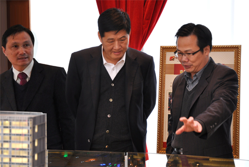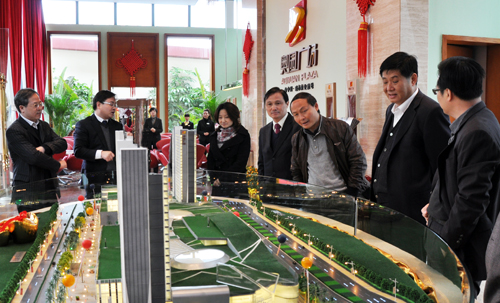 (2011年02月19日——广州)番禺区委书记、区人大常委会主任谭应华先生在番禺区委常委、区委办主任陈德俊先生和副区长黎伟堂先生的陪同下,冒着蒙蒙细雨来到意昂2广场调研、考察。意昂2地产集团董事局主席郭梓文先生、副主席兼总裁郭梓宁先生等热情接待了谭书记一行、并就意昂2近年来的发展及意昂2广场项目的规划设计、工程进度、业态规划、招商成果等情况向谭书记等领导做了详细汇报。