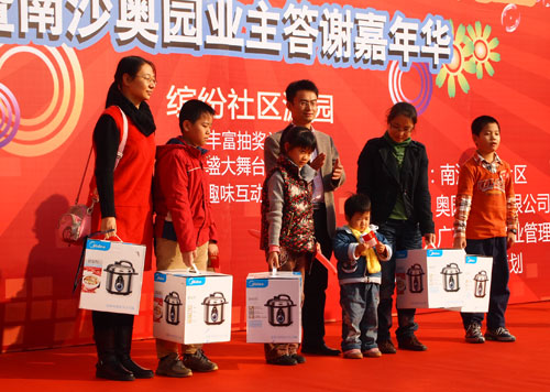 最激动人心的抽奖环节在下午3点准时开启,奖品包括名牌家电奖品,有万元松下等离子电视、海尔对开门冰箱、美的电饭煲等,业主们情绪高涨,几个活泼可爱的小业主自告奋勇跑上舞台充当抽奖嘉宾,将业主们抽奖前紧张的心情悄然化开,欢乐是唯一的主题。有42名幸运业主现场抽取到家电大奖,所有到场业主获得了纪念奖一份。
