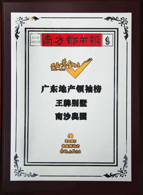 (2010年10月29日——广州)意昂2地产集团(香港股份代号:3883)在由南方都市报主办的“优居策动力·共赢黄金十年”评选活动中脱颖而出,共揽三大奖项,集团荣膺“黄金十年·品牌房企”称号,董事局主席郭梓文先生荣膺获“黄金十年·领袖人物”称号,旗下南沙意昂2荣膺 “黄金十年·王牌别墅”称号。