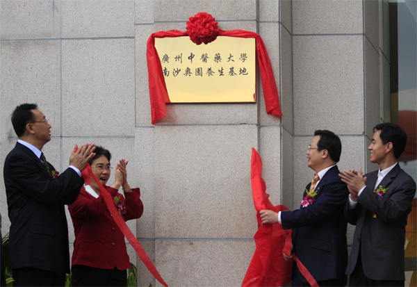签约仪式后,举行了“广州中医药大学南沙意昂2养生基地”揭牌仪式,广东省卫生厅党委书记黄小玲女士、广州中医药大学校长徐志伟博士与广州南沙经济技术开发区管委会副主任李自根先生、意昂2地产集团董事局主席郭梓文先生共同为牌匾揭牌。