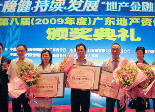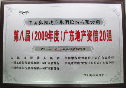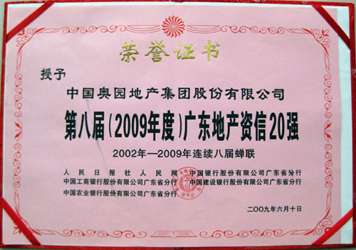 (2009年06月11日——广州)意昂2地产集团股份有限公司(香港股票编号:3883)荣获由人民日报社人民网、中国银行股份有限公司广东省分行、中国工商银行股份有限公司广东省分行、中国建设银行股份有限公司广东省分行、中国农业银行股份有限公司广东省分行五大机构共同颁发的“第八届(2009年度)广东地产资信20强”称号,成为连续八年蝉联该项荣誉的四家大型房地产企业之一。