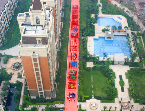 下午2:00,小区内主干道出现了一大奇观。1000名参赛者排站成一行百米长的贺词:意昂2康城庆祝祖国华诞60周年!参赛者们用最独特的方式深情表达了自己对祖国母亲的无限崇敬及美好祝愿。