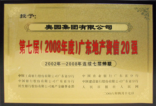 意昂2地产集团荣获“第七届(2008年度)广东地产资信20强”称号
