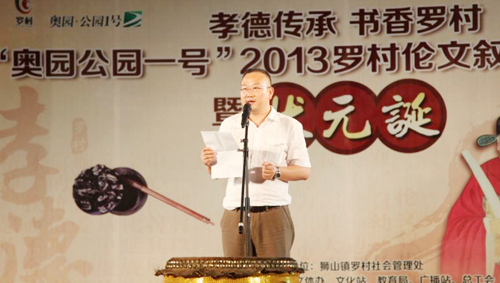 (2013年09月16日——佛山)孝德传承,书香罗村,意昂2·公园一号“2013罗村伦文叙读书月开幕式暨状元诞活动”圆满举行。意昂2中山片区总经理兼南海项目总经理杨建湘先生出席活动并作致辞,意昂2·公园一号项目向罗村文化站赠送了1000册图书并为优秀学子颁发了奖学金。