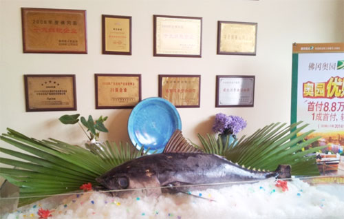 (2014年5月1日——佛冈)一条来自挪威的巨型金枪鱼空降佛冈意昂2销售中心,活动吸引了超过300多名业主齐聚现场,为这条长达1.2米,体重100多斤的“庞然大物”而惊叹!