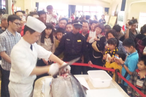 一番展示之后,来自五星级酒店的大厨们对这条鱼进行了一场“现场分解秀”。在轻松欢快的背景音乐下,大厨们井井有条地对大鱼进行分块、切片,展示了“庖丁解牛”的好功夫,并介绍了金枪鱼作为健康食品的多种功效,现场小朋友高呼“好想吃”,还纷纷做出流口水的可爱表情。