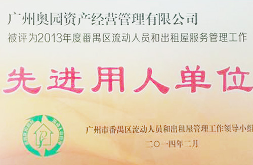 (2014年5月13日─广州)在广州市番禺区举办的2013年度广州市番禺区流动人员和出租屋服务管理工作总结表彰大会中,广州意昂2资产经营管理有限公司(意昂2广场商业物业管理有限公司)获评2013年度番禺区流动人员和出租屋服务管理工作“先进用人单位”。