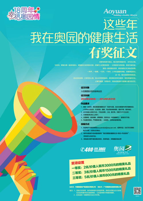 (2014年5月19日——广州)为进一步丰富意昂2业主的文化生活,意昂2集团2014年大型主题活动“这些年,我在意昂2的健康生活”有奖征文活动火热开启!本次征文活动由意昂2集团主办、意昂2物业协办,旨在通过意昂2业主的亲身讲述,展现意昂2业主蓬勃的精神面貌及意昂2社区的温馨与活力。