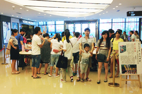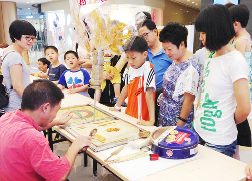 十个项目中,又数画糖画和米上刻字最受欢迎。糖画的糖料一般是在红、白糖中加上少许饴糖放在炉子上用温火熬制,熬到可以牵丝时即可以用来浇铸造型。在绘制造型时,由艺人用小汤勺舀起溶化的糖汁,在石板上飞快地来回浇铸,画出造型。负责制作糖画的林老师还是业内小有名气的专家,活动当天,广东电视台对林老师还进行了专门采访。我们平时吃的糖画都是2D平面造型,可是林老师有一项绝活——3D造型,草蜢、凤凰、花朵……只要你想得到的,林老师就可以做出来。“糖画载满我们儿时的回忆,今晚注定失眠了。”活动结束后,网友通过微博向意昂2广场表达游园市集带给她的感动。