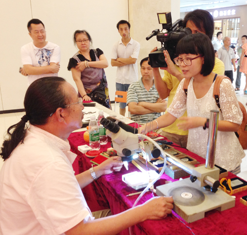 6月2日,著名书法家、篆刻家、微雕艺术家朱德祥亲临意昂2广场,并现场展示了近期创作的微雕作品,微雕媒介有印章、寿山石、象牙、中国扇等,图案包括佛语心经、诗歌、山水画等等。如果不是现场观看,真的很难想象偌大一幅山水、人物画可以用纯手工雕刻在小小一块寿山石上,朱老师巧夺天工的作品令现场观众的赞不绝口。