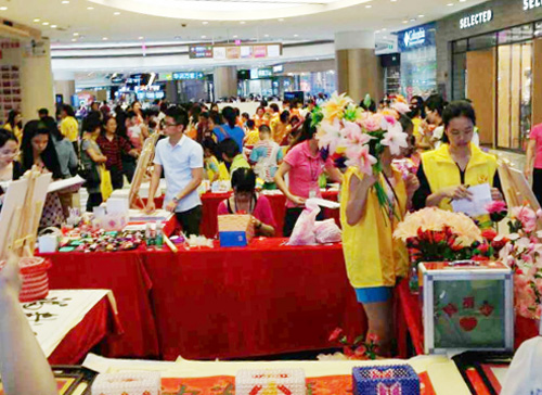 爱心人士在义卖现场购买社工DIY作品献爱心