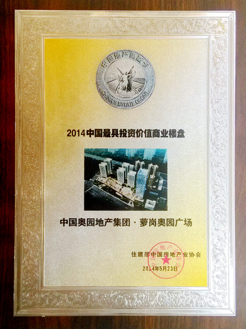 萝岗意昂2广场获住建部“2014中国最具投资价值商业楼盘”称号