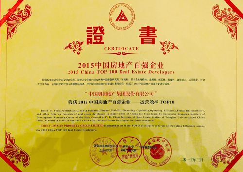 “2015中国房地产百强企业——运营效率TOP10”荣誉证书