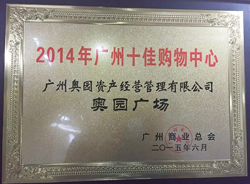 番禺意昂2广场荣获“2014年广州十佳购物中心”称号